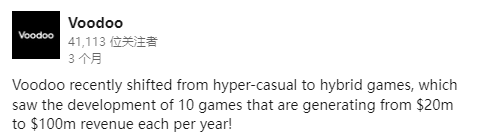 据官方透露,截至2023年5月,Voodoo 已经推出了 10 款成功的混合休闲游戏,每款产品的年收入能够达到 2000 万到 1 亿美元。