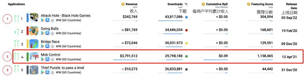 迭代后,《Mob Control》的吸金能力大大提升。2023年第一季度,该游戏以接近3千万次下载量冲上了下载榜单TOP4,且该游戏在该季度收入379万美元,远高于登榜的其他产品,进一步证实了混合休闲游戏突出的变现效率和长线运营优势。