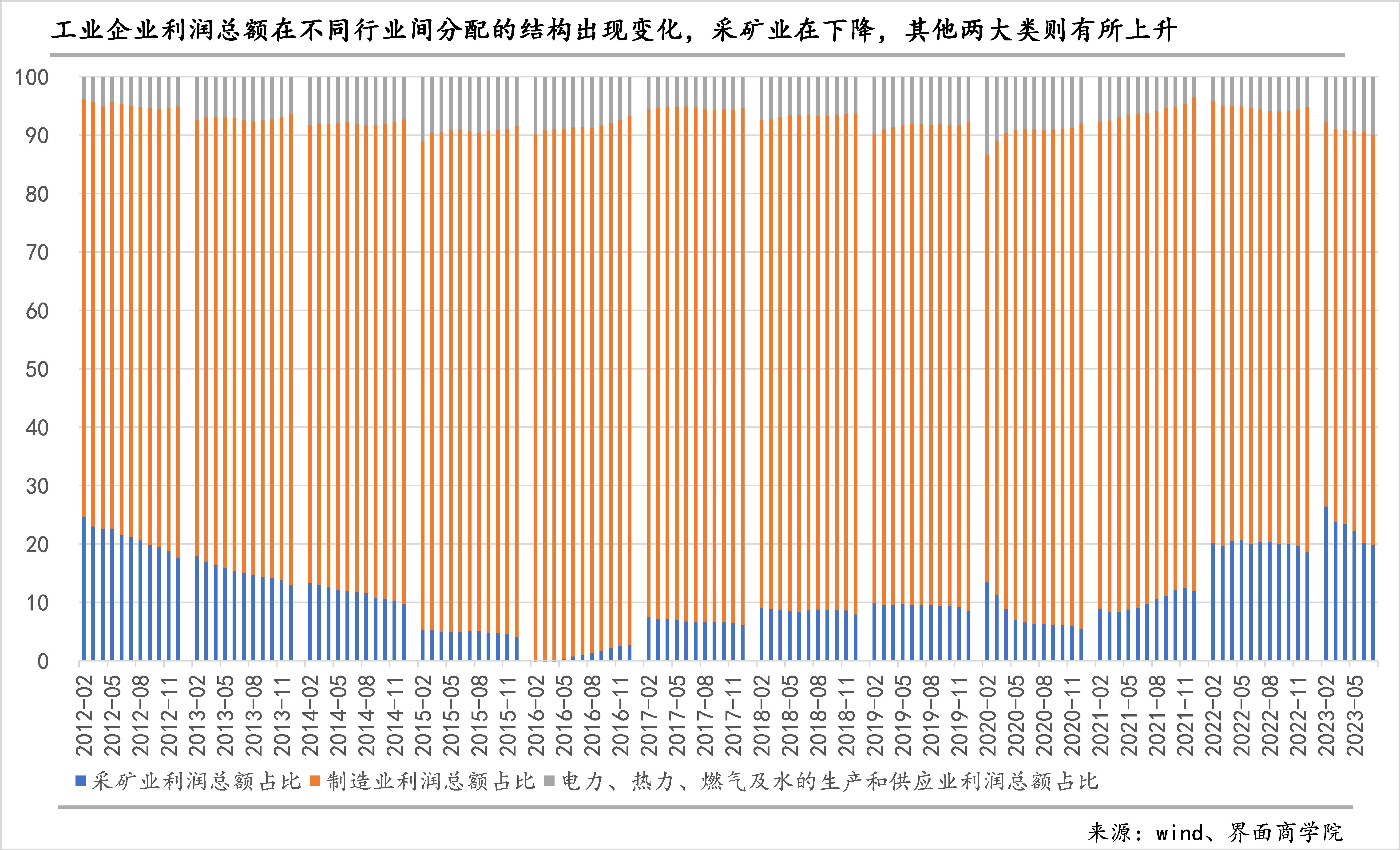 工业企业利润总额的行业占比结构继续调整:上下游企业面临不同价格走势和不同需求压力,二者合力下,工业企业利润在不同行业间的分配结构有所调整。