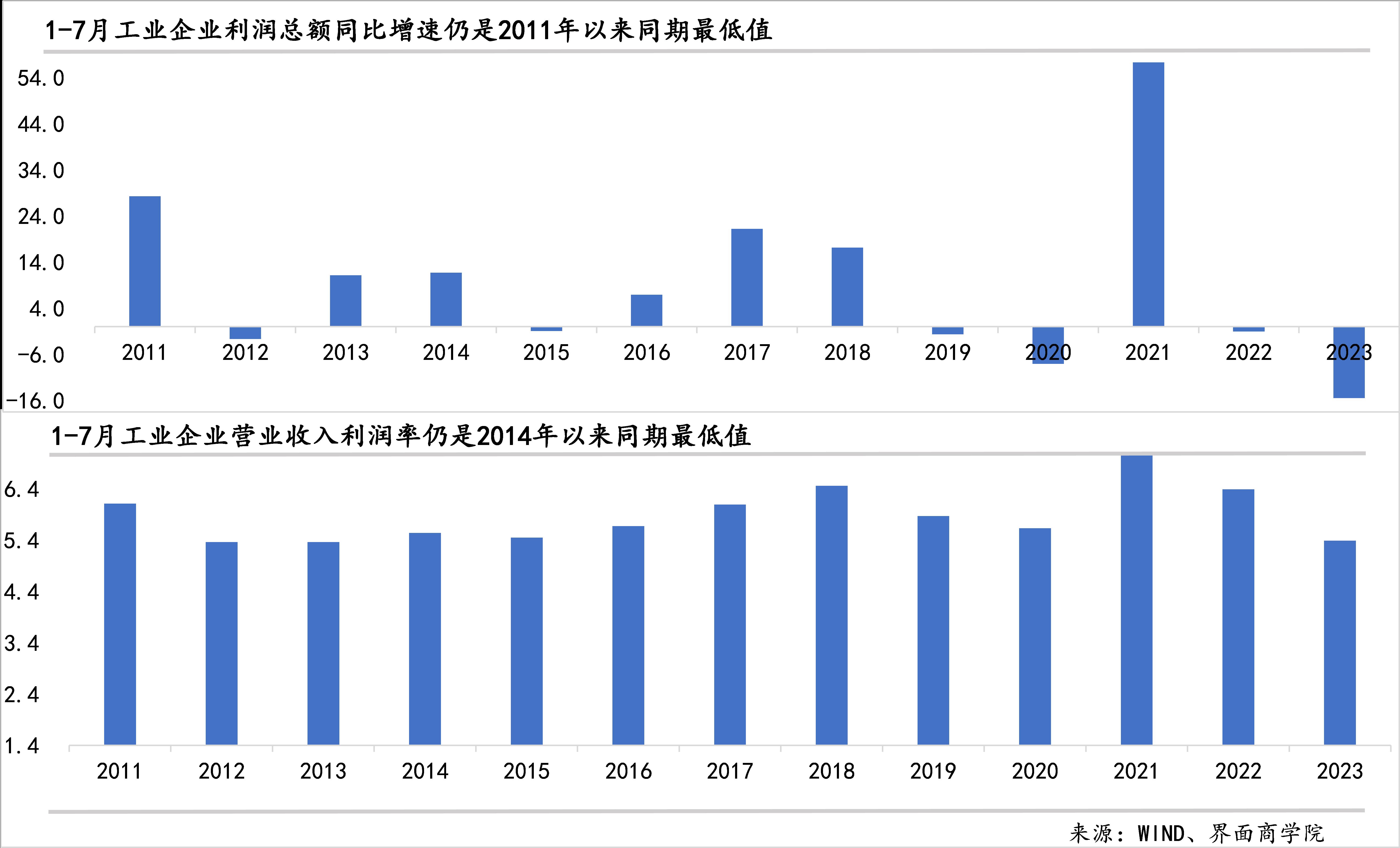 由此,私营工业企业的营业收入利润率上升0.07个百分点至3.86%,较上年同期下降了0.61个百分点;利润总额降幅收窄2.8个百分点至10.7%。不过,需要指出的是,上年同期利润总额增速有比较大的调整,2022年前7月降幅较前6个月扩大了3.8个百分点;与此同时,营业收入利润率在历史同期7月较6月份变化幅度的平均值为上升0.01个百分点。