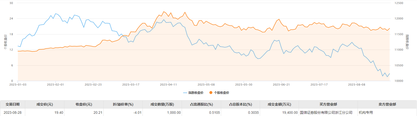 8月28日,大华股份出现1笔1.94亿元折价大宗交易,成交价19.4元,折价率4.01%,卖方为机构席位,买方为国信证券浙江分公司。