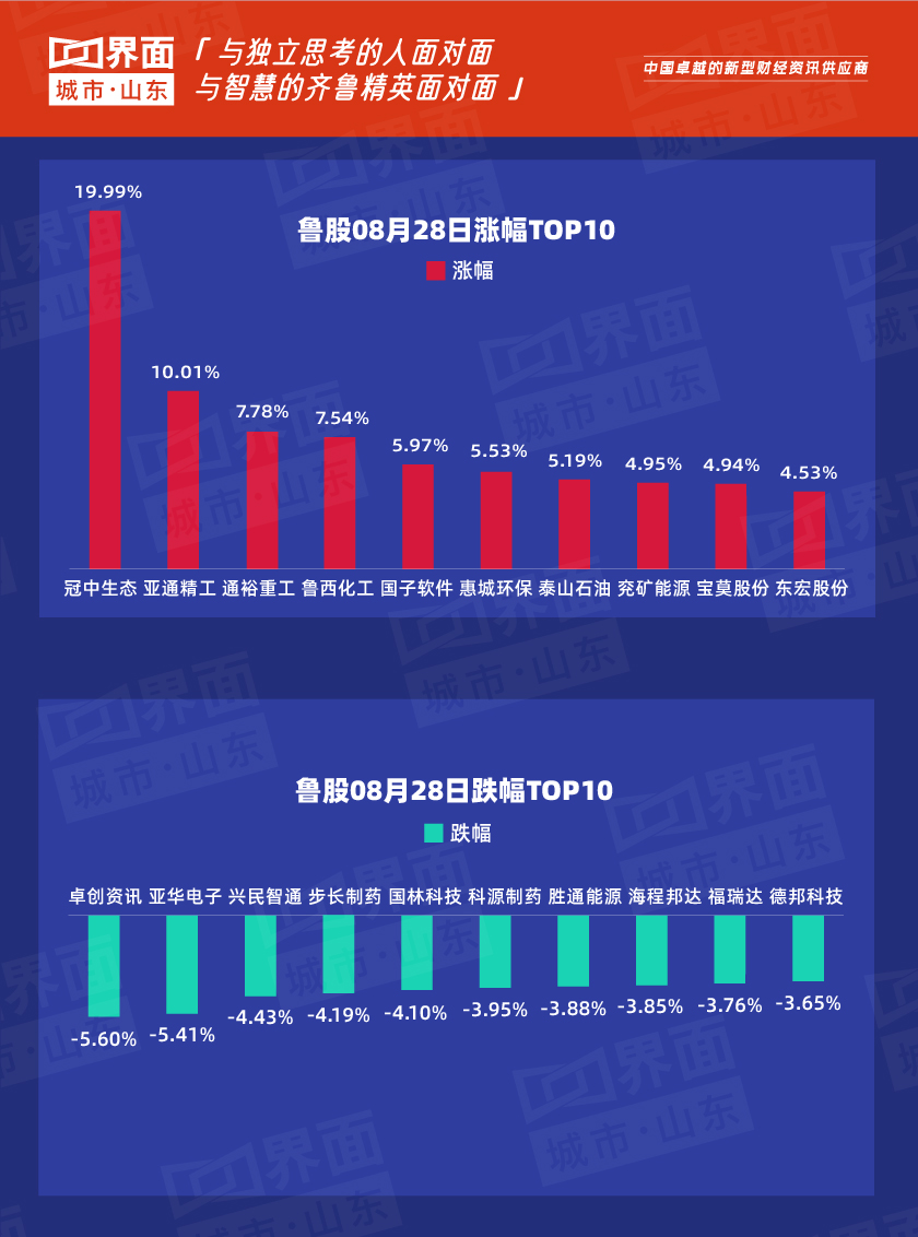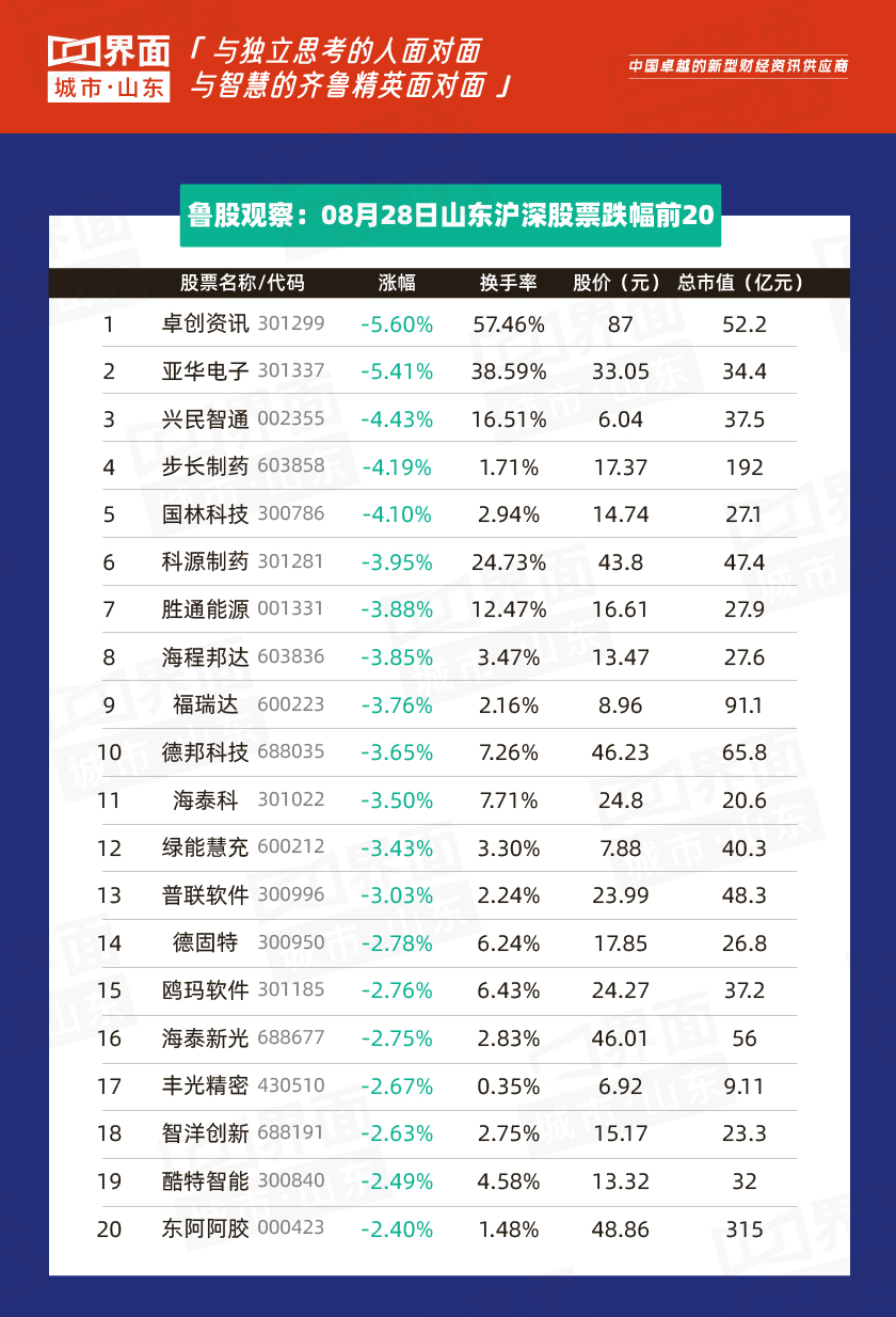 8月28日,山东省内沪深股票有206只个股上涨,96只个股下跌;总市值过千亿的有万华化学(600309)、海尔智家(600690)、兖州煤业(600188)、青岛啤酒(600600)、中航沈飞(600760)、山东黄金(600547)、潍柴动力(000338)共7家,500亿-1000亿的共有6家,分别是中际旭创(300308)、华鲁恒升(600426)、歌尔股份(002241)、浪潮信息(000977)、华电国际(600027)、中泰证券(600918)。