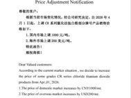 3月31日晚,中信钛业发布调价函:根据当前市场变化情况,经公司研究决定,自2026年4月1日起,上调CR系列氯化法钛白粉部分牌号产品销售价格如下:国内市场上调1000元/吨,海外市场上调200美元/吨。 - 21:57