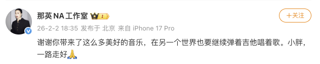 2月2日,据台媒报道,著名歌手、音乐制作人袁惟仁病逝,享年57岁。 资深音乐人陈子鸿等转发袁惟仁家属悼文:“大家好,小胖选择今天离开我们,我们尊重他的意愿,他走得平静,从此自由。我们会带他回台北和我父亲安葬在一起,一个有山有水他熟悉的地方。庆幸他留下很多歌曲,想念他时听,开车时听,伤心时听,平静时听他无所不在。谢谢所有帮助、关怀小胖的朋友,他是带着你们的温暖离开的。” 歌手老狼也发文悼念:“R.I.P 小胖。” 袁惟仁外号“小胖老师”,为中国台湾男歌手、词曲作家及音乐制作人,曾担任SHE、动力火车、齐秦等歌手的专辑制作人,曾写过《征服》、《旋木》、《梦醒了》、《离开我》、《梦一场》等经典歌曲。 - 18:06