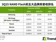 根据TrendForce集邦咨询最新调查,2025年第三季因云端服务业者(CSP)持续扩建AI基础建设,对Enterprise SSD(企业级SSD)需求强劲,带动前五大NAND Flash品牌商合计营收季增16.5%,逼近171亿美元。上半年的减产措施奏效,下半年供需失衡情况获得改善,加上Enterprise SSD销售占比提高,各原厂的平均销售单价(ASP)皆有上涨。分析各供应商第三季营收表现,Samsung(三星)Enterprise SSD销售强劲,推升第三季营收季增15.4%至60亿美元,以32.3%市占维持第一名。 - 16:40