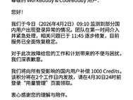 4月2日午间,@腾讯云 发布关于WorkBuddy & CodeBuddy登录异常的致歉与补偿说明:今天上午部分用户登录异常,目前已全部恢复,将为受影响用户补偿1000 Credits。 - 12:55