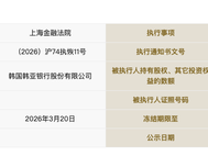 国家企业信用信息公示系统网站显示,近日,韩亚银行(中国)有限公司新增一则股权冻结信息,被执行人为韩国韩亚银行股份有限公司,冻结股权数额33.5亿元,冻结期限为3年,执行法院为上海金融法院。韩亚银行(中国)有限公司成立于2007年12月,法定代表人为金光日,注册资本33.5亿人民币,经营范围包括吸收公众存款、办理票据承兑与贴现、提供信用证服务及担保等,由韩国韩亚银行股份有限公司全资持股。 - 11:42