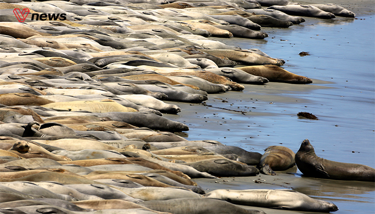 夏日海滩欢乐多,美国数以万计象豹上岸晒太...