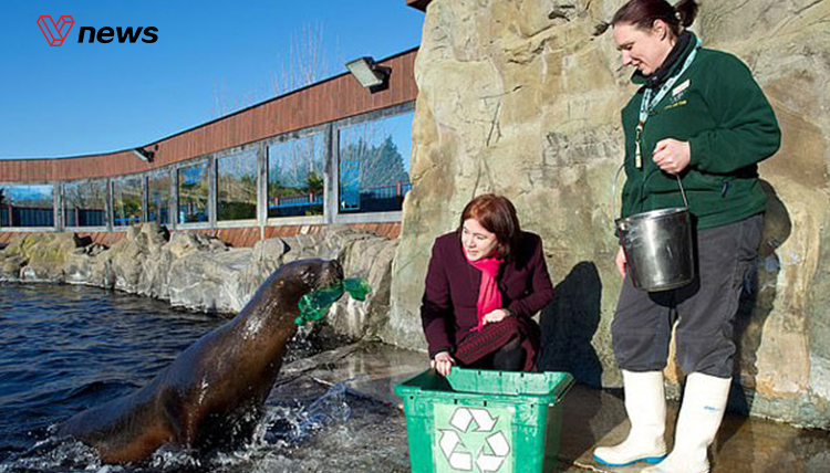 英国科尔切斯特动物园训练海狮捡垃圾 ,通...