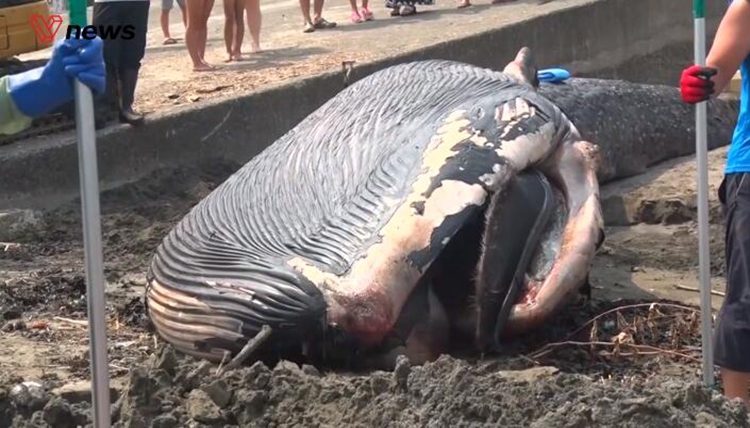 一只雄性蓝鲸幼崽尸体被冲上了沙滩