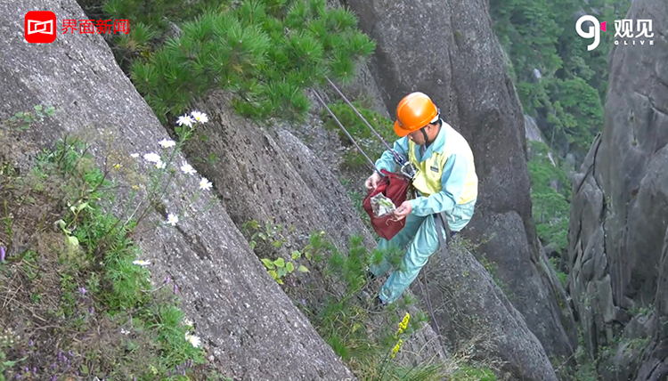 国庆黄金周游客暴增 黄山放绳工下悬崖捡垃...