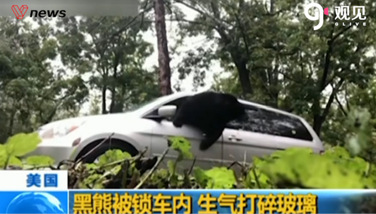 美国一黑熊钻进汽车后被困车内 怒砸车窗后...